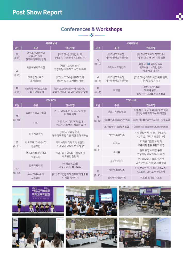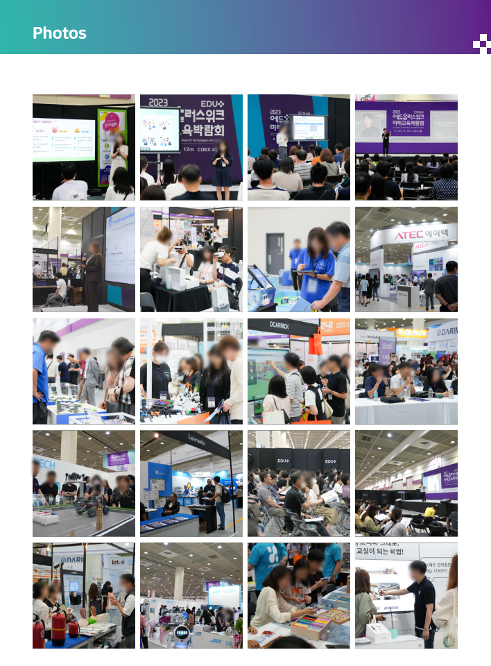 이번 박람회는 AI교육, SW교육, AR⦁VR, 코딩, 빅데이터, 비대면교육, 스마트러닝, 교육플랫폼, 교육용 애플리케이션, 실내체육, 방과후학습, 교육용 완구, 놀이교육시설, 학원, 학용품 등을 '전시품목'으로 진행하며, 학교장 · 교사 · 교직원 · 방과후강사 등 '교사 및 교직원', 정부 · 교육청 · 교육기관 · 단체 관계자 등 '교육기관 관계자', 교육교재 유통사 · 교육기업 담당자 등 '교육기업', 학부모 · 초 / 중 / 고 / 대학생 등 ' 일반 관람객'을 관람대상으로 박람회가 개최, 진행됩니다.