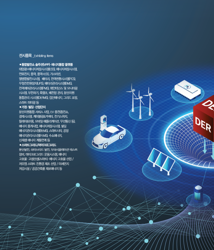 통합발전소 솔루션(VPP)·에너지통합 플랫폼, 가정·빌딩·산업단지, 스마트그리드/마이크로그리드를 전시품목으로 하는 이번 엑스포는 신재생에너지 산업정책과 보급 시책을 적극적으로 홍보하고, 통합발전소 솔루션(VPP)와 에너지통합 플랫폼을 활용한 에너지 관련 기업의 활발한 시장 진출의 교두보를 확보함은 물론, 기업의 기술 개발과 산업 육성에 기여하기 위한 목적으로 개최, 진행 됩니다.