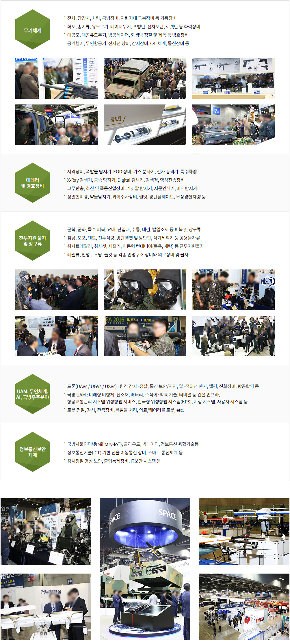 지상무기 체계, 대테러 및 경호장비, 전투지원 물자 및 장구류, 해양무기 체계, 전자장비 체계, UAM / 무인체계(드론, 로봇), 인공지능(AI), 국방우주분야, 정보통신보안 체계 등
