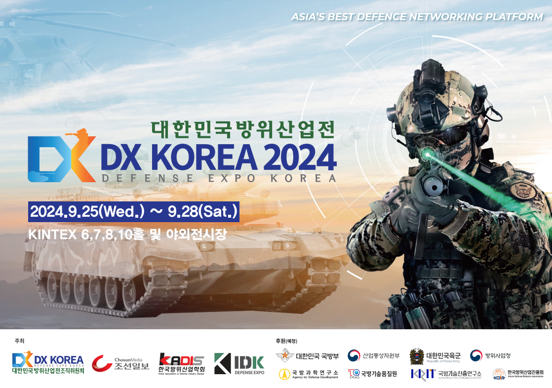국내 방산기업의 대외 경쟁력 강화 및 수출확대 여건 조성과 방위산업 전문전시회를 통해 국내 · 외 기업간 기술교류 및 협력, 방산 대기업과 중소기업간 상생협력을 통한 방위산업 발전 도모, 첨단과학 기술의 군사력 접목과 미래혁신을 선도하는 국방력 소개 및 국민의 생명과 재산을 지키는 책임국방 실행을 행사 목벅으로 하는 ' 제6회 대한민국방위산업전(DX KOREA 2024)'이 2024년 9월 25일 수요이룹터 9월 28일 토요일 까지 킨텍스에서 개최됩니다.