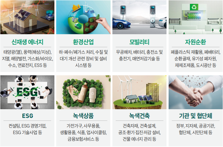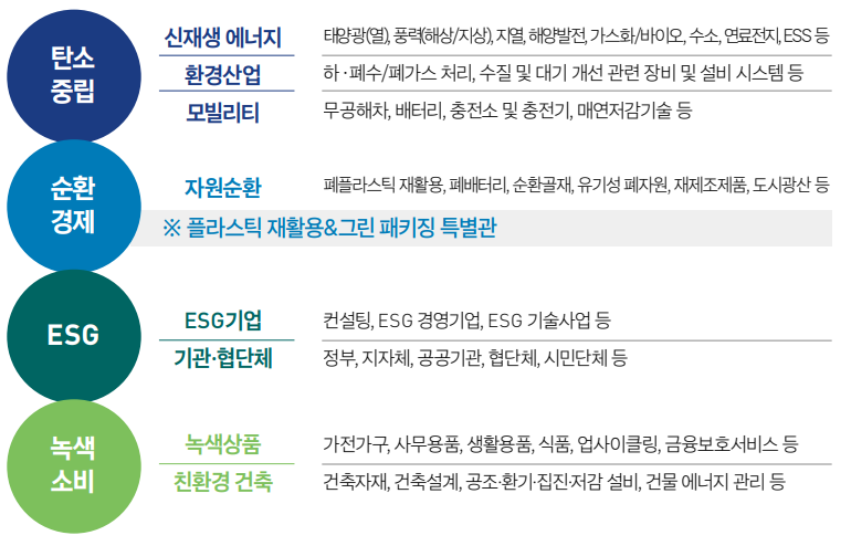 신재생 에너지, 환경산업, 자원순환, 폐플라스틱, ESG 경영, 녹색상품, 친환경 건축 등