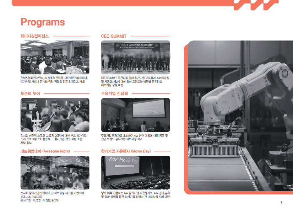 무역협회 해외바이어 수출 상담회, 2025 산업지능화 컨퍼런스, 지능형 로보틱스 컨퍼런스, 머신비전 기술 세미나 등 총 200여개 세션, CEO SUMMIT, AW Docent Tours