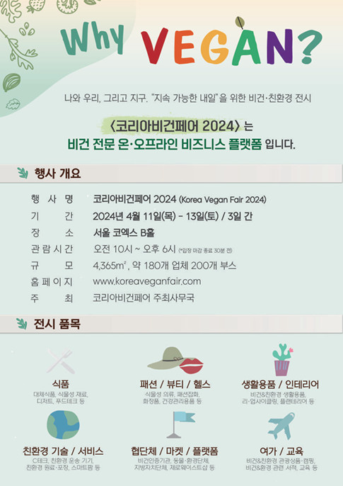 '살아있는 모든 생명을 존중합니다.'라는 주제와 함께 '비건식품, 생활용품, 인테리어, 패션, 뷰티, 헬스, 친환경기술 및 서비스, 여가, 교육' 등을 전시품목으로 하는 '코리아비건페어 2024(Korea Vegan Fair 2024)' 가 2024년 4월 11일, 목요일 부터 13일, 토요일까지 3일간 코엑스에서 개최됩니다.