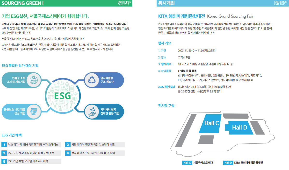 Gift 용품, Home Living, Beauty Fashion, Smart & Mobile 기기, 건강·의료용품, 친환경제품, 스포츠레저 용품, 건강 보조제, 취미·완구·DIY 등 Wellness, 건강기능식품, 가공식품류 등 Food, 제조, 물류, 패키징, 마케팅 솔루션, 디자인, 프린팅 등 Solution 등을 전시품목으로하는 '소비재 제조·유통 B2B 전시회 2023 서울국제소싱페어(Seoul International Sourcing Fair 2023)'가 코엑스에서 개최됩니다.
