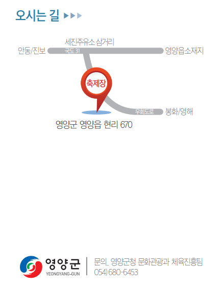 한겨울 스케이트, 얼음썰매, 눈썰매, 빙어낚을 수 있는 얼음낚시를 즐길 수 있으면서 에어쉼터, 매점, 푸드트럭 등을 이용할 수 있는 ' 제1회 영양 꽁꽁 겨울축제'가 2024년 1월 5일 금요일 부터 1월 28일 일요일 까지 경상북도 영양군 영양읍 현리 670번지 빙상장일원에서 개최, 운영하고 있습니다.