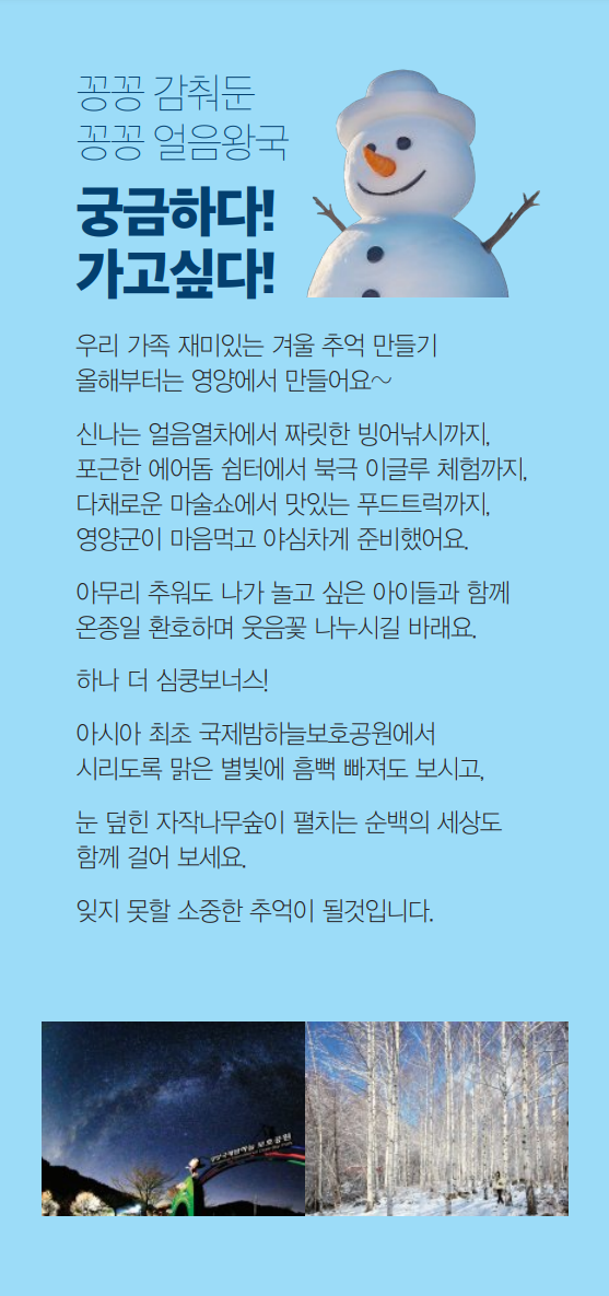 신나는 얼음열차에서 짜릿한 빙어낚시까지, 포근한 에어돔 쉼터에서 북극 이글루 체험까지, 다채로운 마술쇼에서 맛있는 푸드트럭까지, 영양군이 마음먹고 야심차게 준비했어요. 아무리 추워도 나가 놀고 싶은 아이들과 함께 온종일 환호하며 웃음꽃 나누시길 바래요. 하나 더 심쿵보너스! 아시아 최초 국제밤하늘보호공원에서 시리도록 맑은 별빛에 흠뻑 빠져도 보시고, 눈 덮힌 자작나무숲이 펼치는 순백의 세상도 함께 걸어 보세요. 잊지 못할 소중한 추억이 될것입니다.