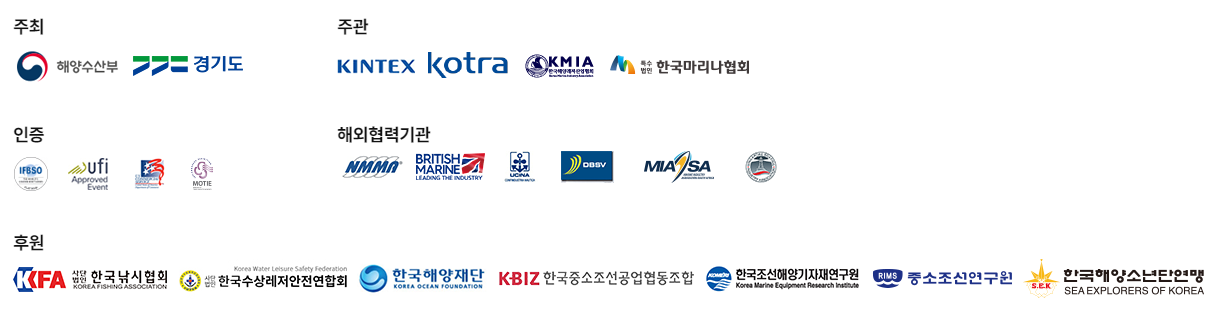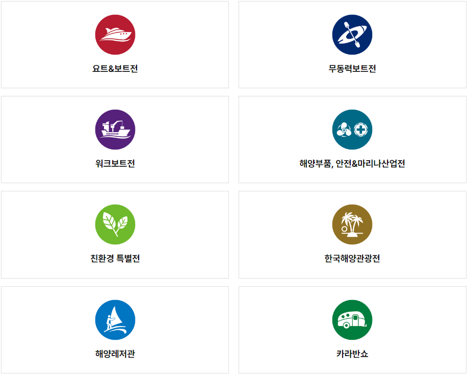 요트&보트전, 무동력보트전, 워크보트전, 해양부품, 안전&마리나산업전, 친환경 특별전, 한국해양관광전, 해양레저관, 카라반쇼