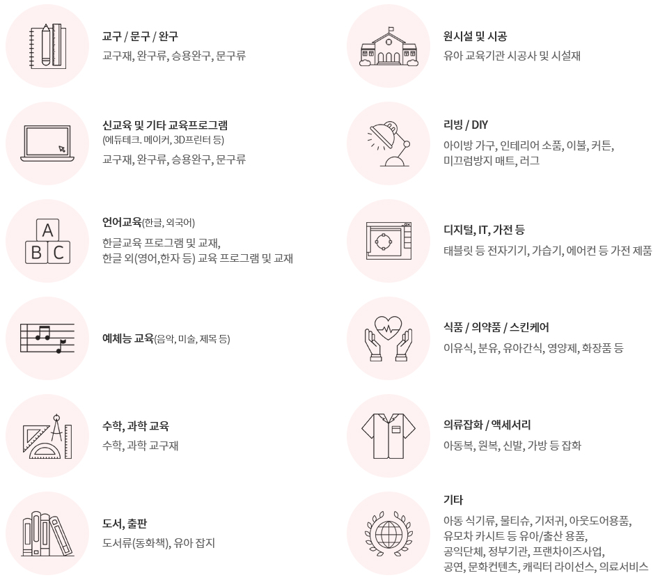 학습, 교육 프로그램, 프랜차이즈, 완구, 게임, 원용품, 운영용품, 캐릭터용품, 아이방용품, 출판, 문구, 시설, 컨텐츠형 학습용품, 유아용품 등