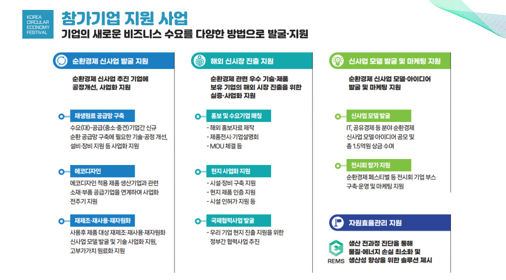 | 2 | 전시회 참가 지원 | • 순환경제 관련 국내·외 전시회 참가 지원 - 부스 임차비, 부스 제작비 지원 |