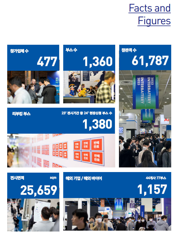 인터배터리는 2013년 최초 개최 이후 11년 동안 배터리 산업과 동반성장한 글로벌 대표 배터리 전시회입니다. 2023년 477개사 1,360부스, 참관객 61,787명으로 역대 최대 규모로 개최된 인터배터리는 24년도에 더욱 성장한 500개사 2,200부스, 참관객 75,000명 규모로 개최됩니다. 세계 TOP 5 배터리 제조사 중 3개 기업이 참가하는 유일한 전시회로서, 배터리 산업을 이끄는 LG에너지솔루션, 삼성SDI, SK온을 비롯한 경쟁력 있는 K-배터리 기업이 매년 대규모로 참가하여 글로벌 배터리 트렌드를 선보이고, 배터리 밸류체인 내 산업들과 네트워킹하며 비즈니스를 확장할 수 있는 기회를 제공하는 탁월한 비즈니스 플랫폼입니다.