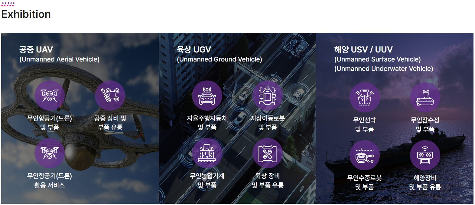 국방, 농수산, 물류, 건설, 측량, 재난관리, 인명구조 등 다양한 분야에서의 혁신 기술과 솔루션을 한 자리에서 만나볼 수 있는 이번 전시회는 무인항공기(드론)및 부품, 공중 장비 및 부품 유통, 무인항공기(드론) 활용 서비스, 자율주행자동차 및 부품, 지상이동로봇 및 부품, 무인농업기계 및 부품, 육상 장비 및 부품 유통, 무인선박 및 부품, 무인잠수정 및 부품, 무인수중로봇 및 부품, 해양장비 및 부품 유통 등을 전시품목으로 개최, 진행됩니다.