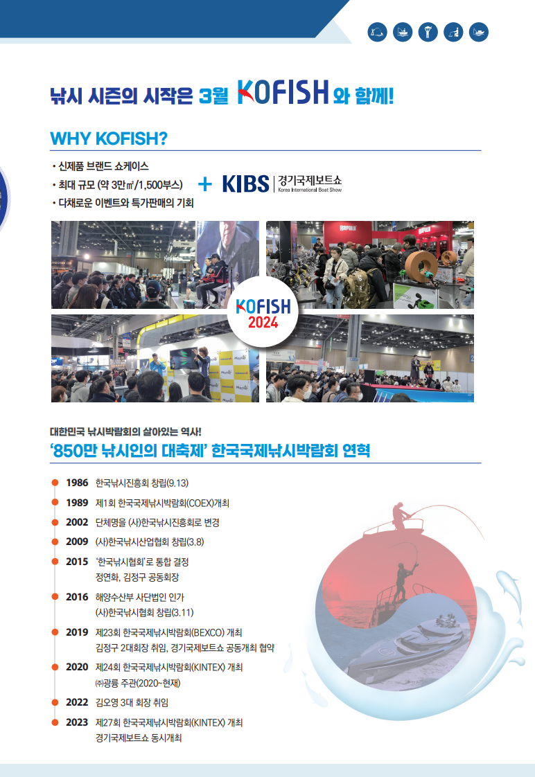 낚시산업 지원, 판로 확대 등 지역 및 국가산업으로서의 육성, 건전한 낚시문화 정착을 통한 국민 삶의 질 향상을 행사목적으로하는 '2024 한국국제낚시박람회 (Korea International Fishing Show, KOFISH 2024) 가 2024년 3월 8일 금요일 부터10일 일요일 까지 3일간 킨텍스에서 개최됩니다.